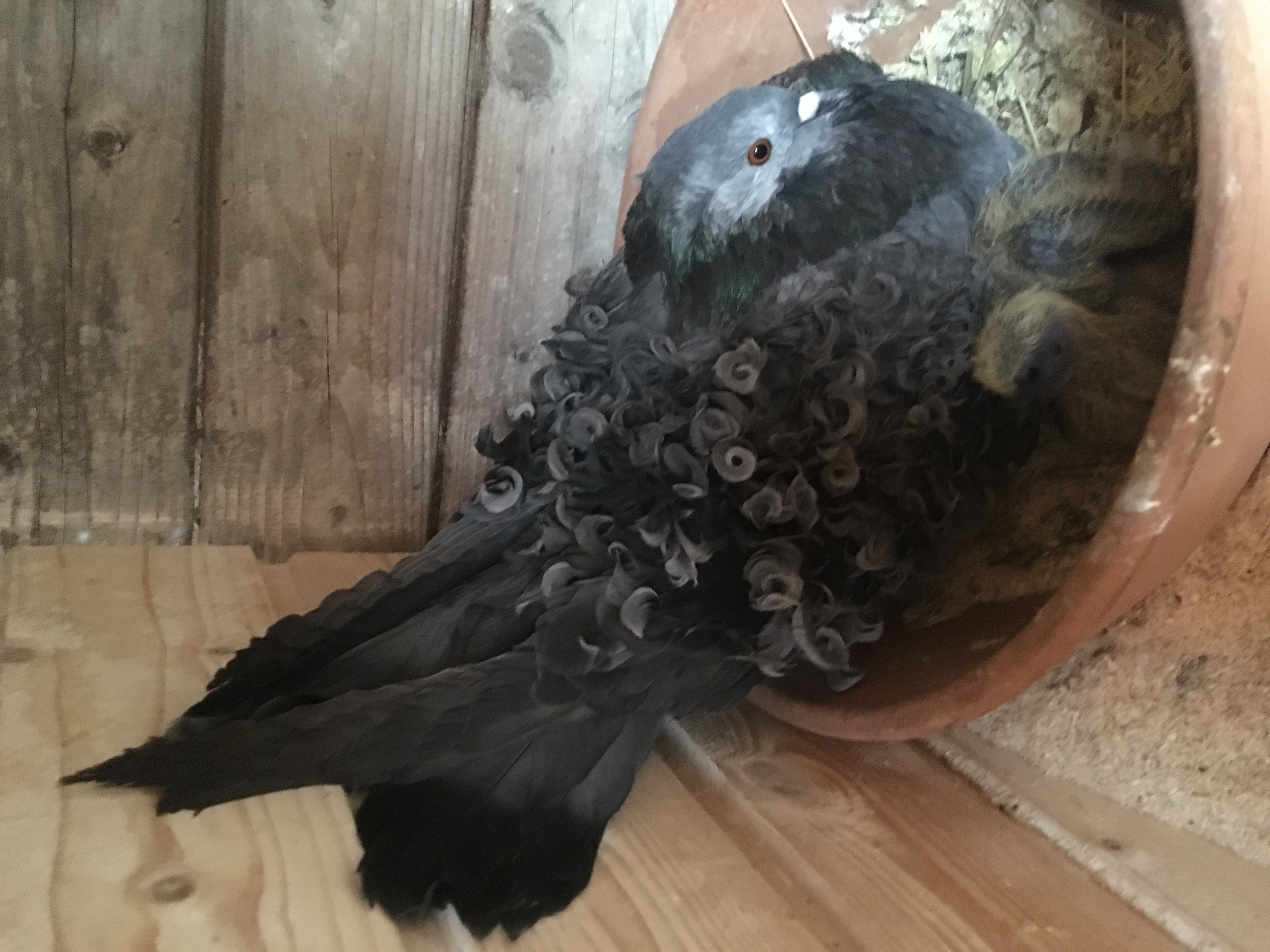 Gefieder: jede Feder des Flügelschildes soll eine feste, breite und geschlossene Locke bilden, durchgelockte Bindenfedern erhöhen den Wert des Strukturbildes, leichte Struktur an den Halsseiten zulässig